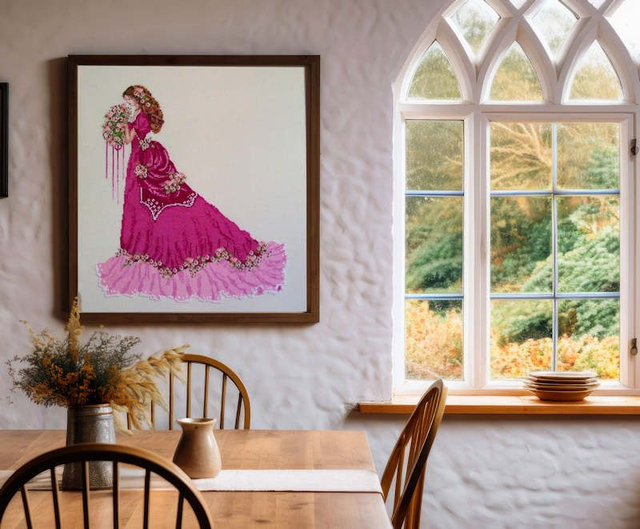 Il modello è stato eseguito su lino Florentia 120 fili PR color Champagne, può essere ricamato anche su Aida Arcadia 60 fori PR dello stesso colore